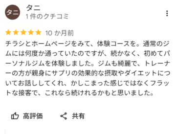 体験コースに参加していただき、また、ジムの環境やトレーナーの接客についてお褒めの言葉をいただき大変嬉しく思います!